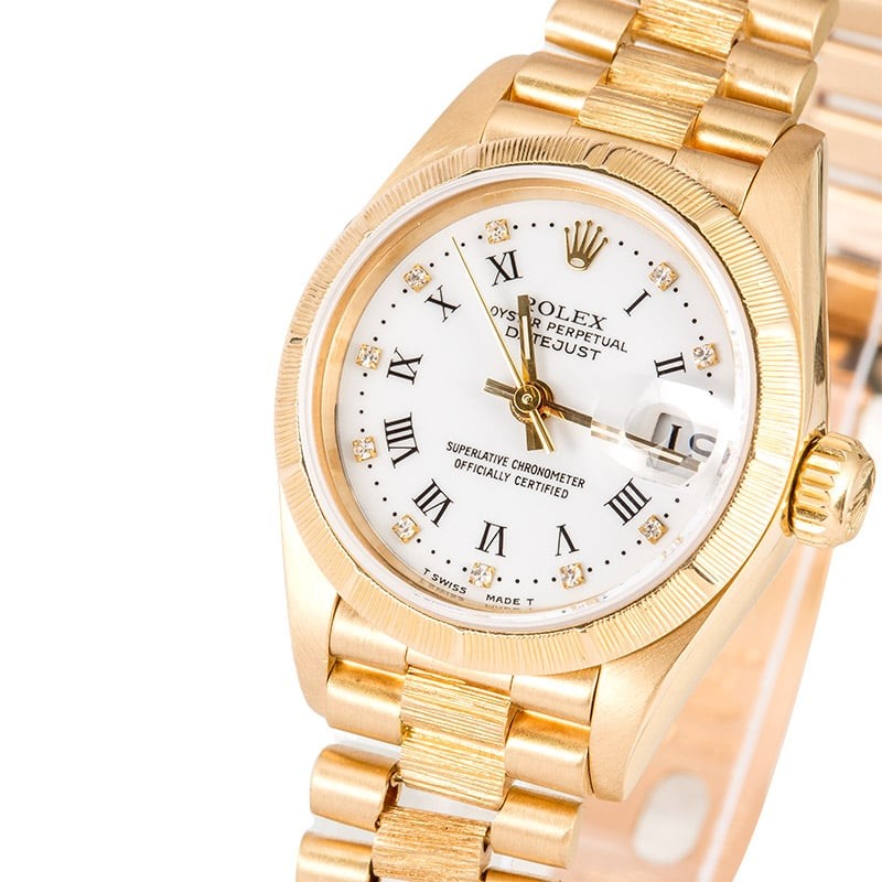 - Bracelet: 18k yellow gold Presidential bracelet w/ bark accents on center links and concealed Crownclasp