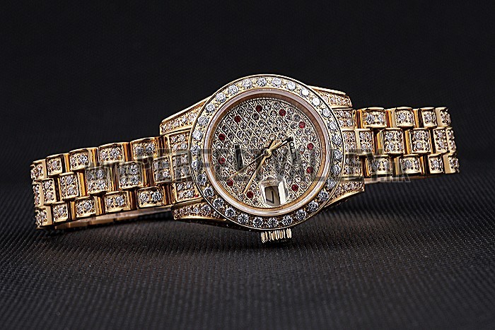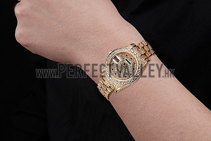 - Bracelet: Diamond encrusted 18k yellow gold plated link bracelet with cutwork Rolex logo deployment clasp