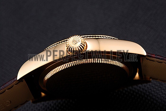 - Bracelet: Rolex and logo heat embossed brown crocodile leather strap with logo carved 18k yellow gold plated hook-buckle clasp