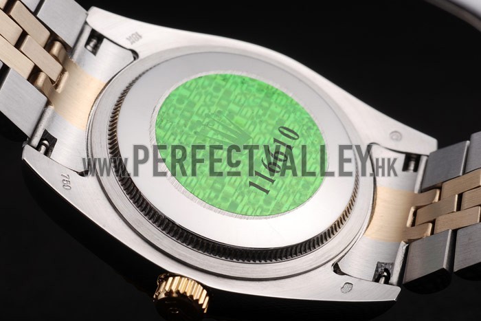 - Back: Stainless steel push-in case back with green Rolex logo stamp