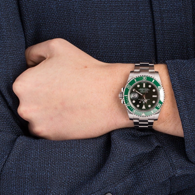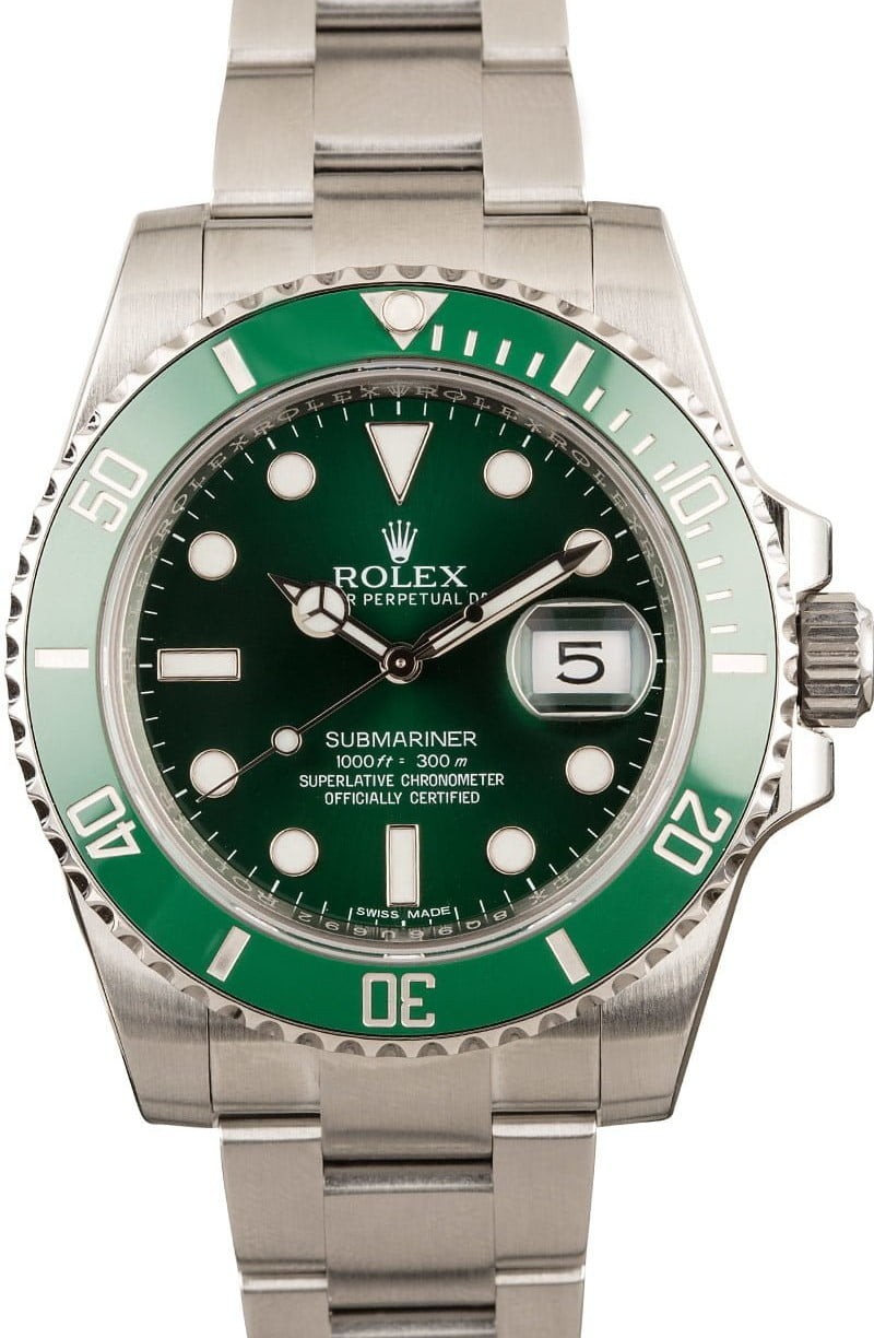 - Case: Stainless steel (40mm) w/ green "Hulk" ceramic bezel, inner reflector ring engraved with serial number and scratch resistant sapphire crystal