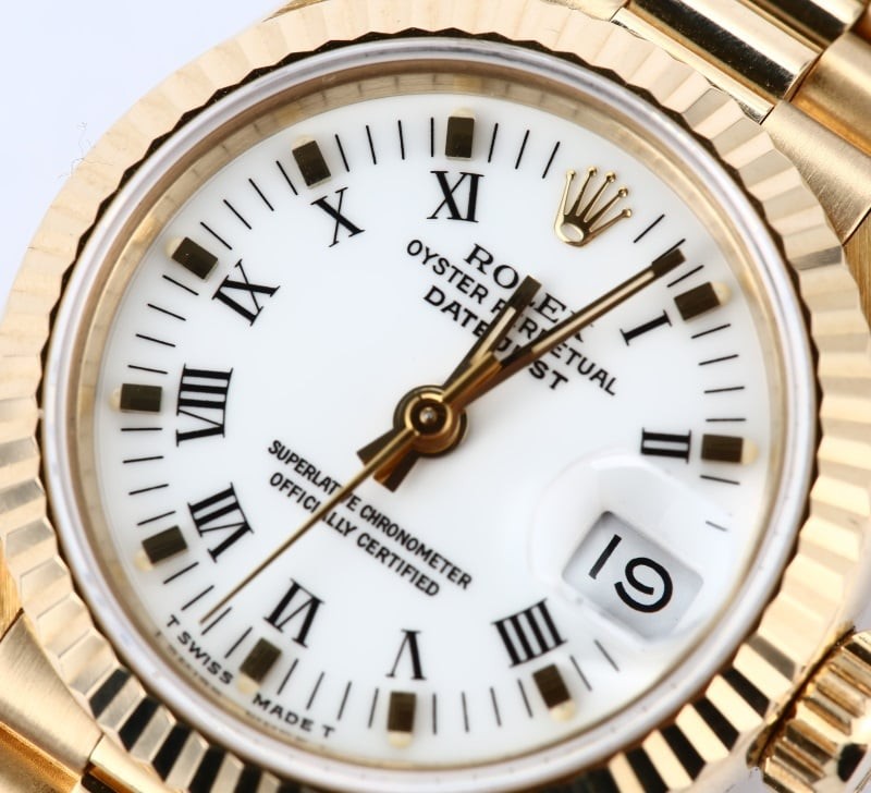 - Case: 18k yellow gold (26mm) w/ fluted bezel